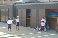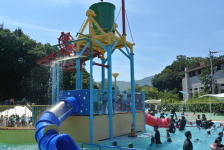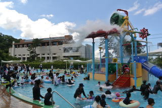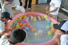大人気の大きなすべり台では、最初はこわごわすべっていた1年生も、すぐに慣れて何回も挑戦していました。大型バケツのしたで水をかぶったり、浮き輪で浮かんでいたり、思い思いに楽しんでいました。