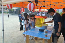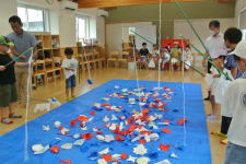 かき氷、綿菓子、ヨーヨー釣り、バスケットダービー、輪投げ、お宝釣り。 お宝釣りのお宝は、今年もみんなが作った大きな折り紙の作品です。