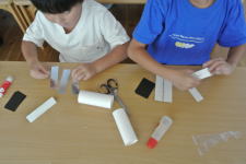 土台はトイレットペーパーの芯。透明の円盤に美しい模様の紙を4枚貼るものと、透明の容器に色とりどりの美しい石や貝殻、ビーズなどを入れて、その中に洗濯のりを注ぐものの2種類作りました。