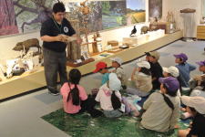 博物館には、東広島市に生息している動物のはく製や、学生たちが作ったオオサンショウウオの骨格標本、昆虫の標本、恐竜の化石、生きている魚や亀など、たくさんの展示物があり、中には触っていいものもあります。