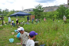 ビオトープでは、ザリガニやヤゴ、小さな魚などを網ですくって観察しました。
