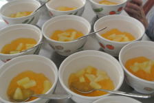 材料は、オレンジジュースとリンゴジュース、ゼラチン、砂糖、パイン缶と、シンプルですが、暑い日には最高。 おかわりには、行列ができます。