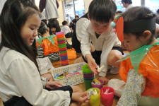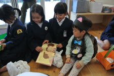 あらかじめ準備しておいた折り紙のプレゼントを渡した後で、絵本を読んだり、おもちゃで遊んであげたりしました。自分たちより小さな子どもたちを喜ばせようと一生懸命な姿がほほえましかったです。